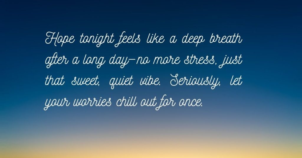 1. Hope tonight feels like a deep breath after a long day—no more stress, just that sweet, quiet vibe. Seriously, let your worries chill out for once. May your heart feel lighter than your phone on airplane mode, and hey, here’s to those wild, happy dreams sneaking in when you finally crash.